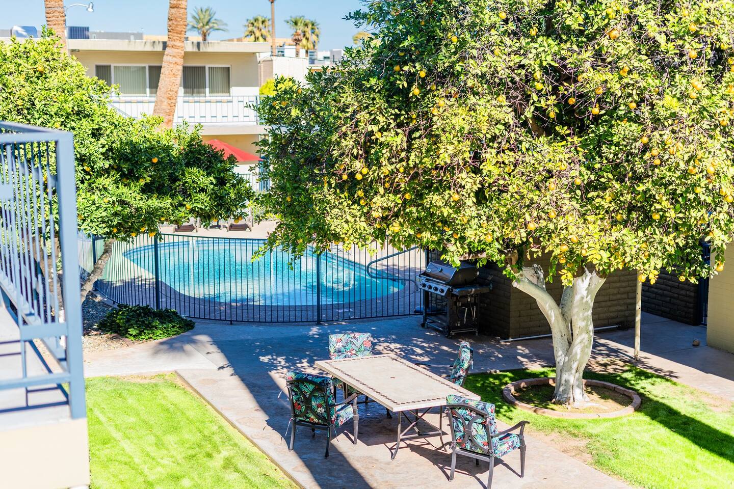 Guests have access to a community pool and outdoor dining space.